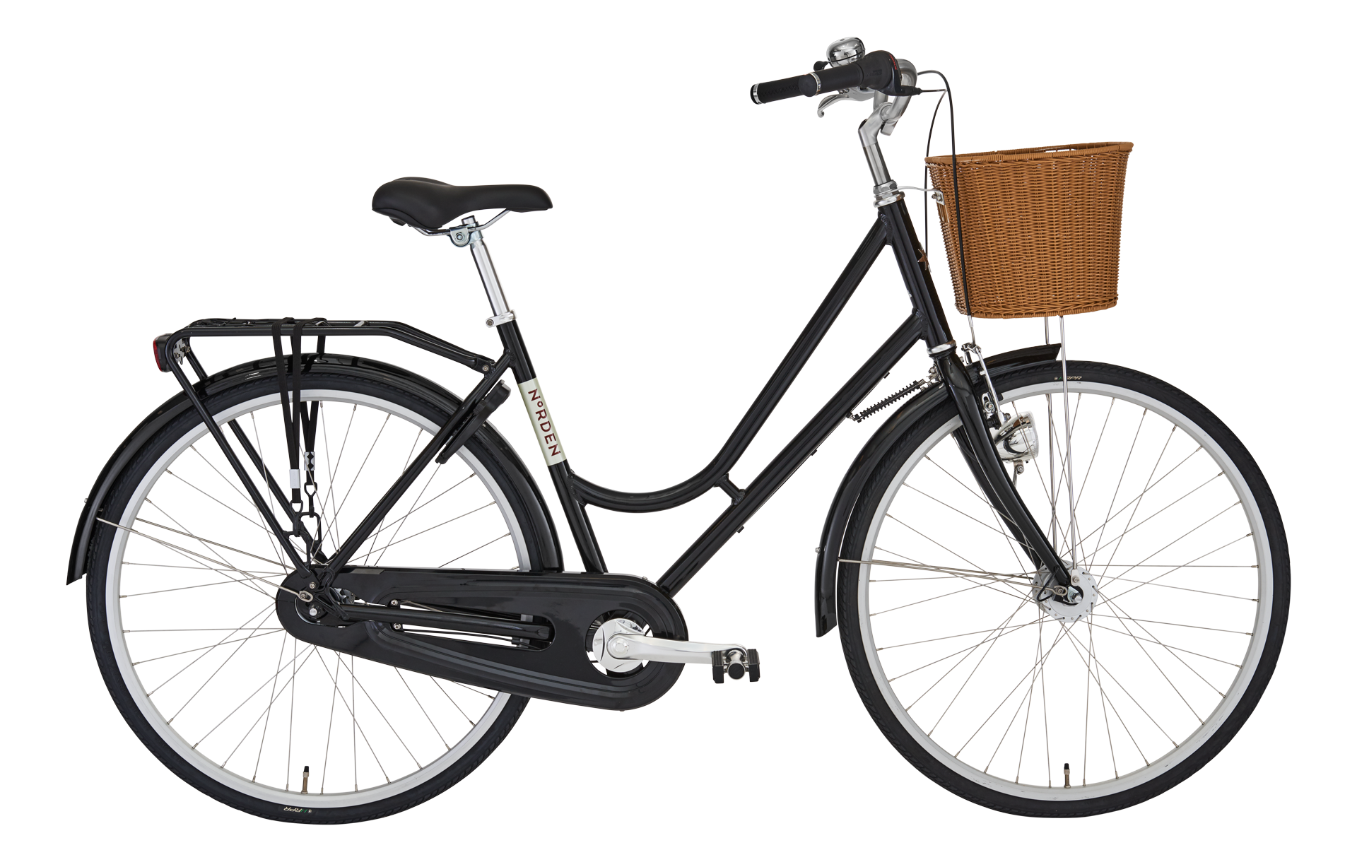 Cyklen er udstyret med en lukket kædeskærm, farvematchede skærme og karakteristiske NORDEN-håndtag, der fuldender det gennemførte design. Den fastmonterede forlygte drives af en navdynamo, så du altid har lys helt uden batteribekymringer.