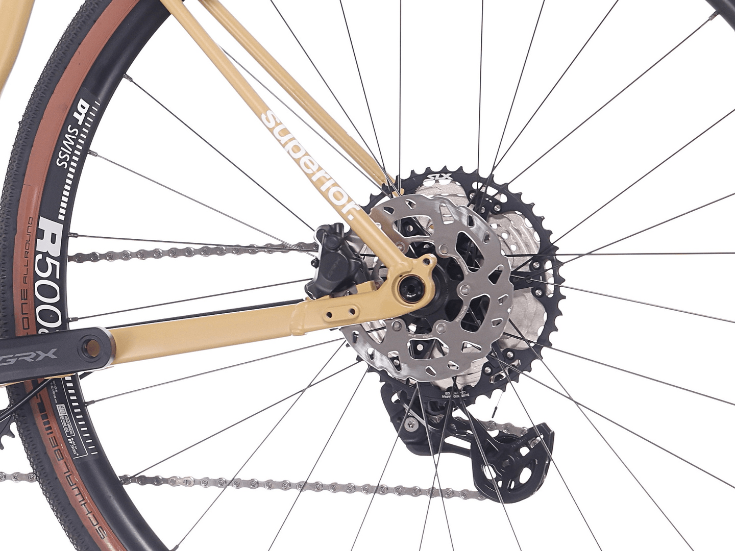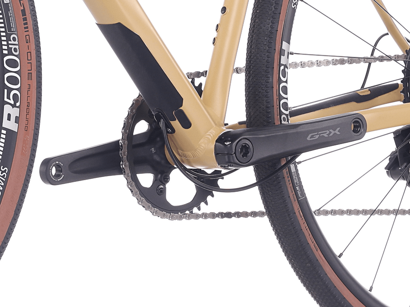 Cyklen er udstyret med Shimano GRX 1x12 drivlinje, som sikrer præcis gearskiftning og et bredt gearområde til varieret terræn. Tubeless ready DT Swiss R500 hjul og brede Schwalbe G-One Allround dæk giver komfort, greb og lav rullemodstand, mens de mange monteringspunkter gør cyklen ideel til bikepacking og længere ture.