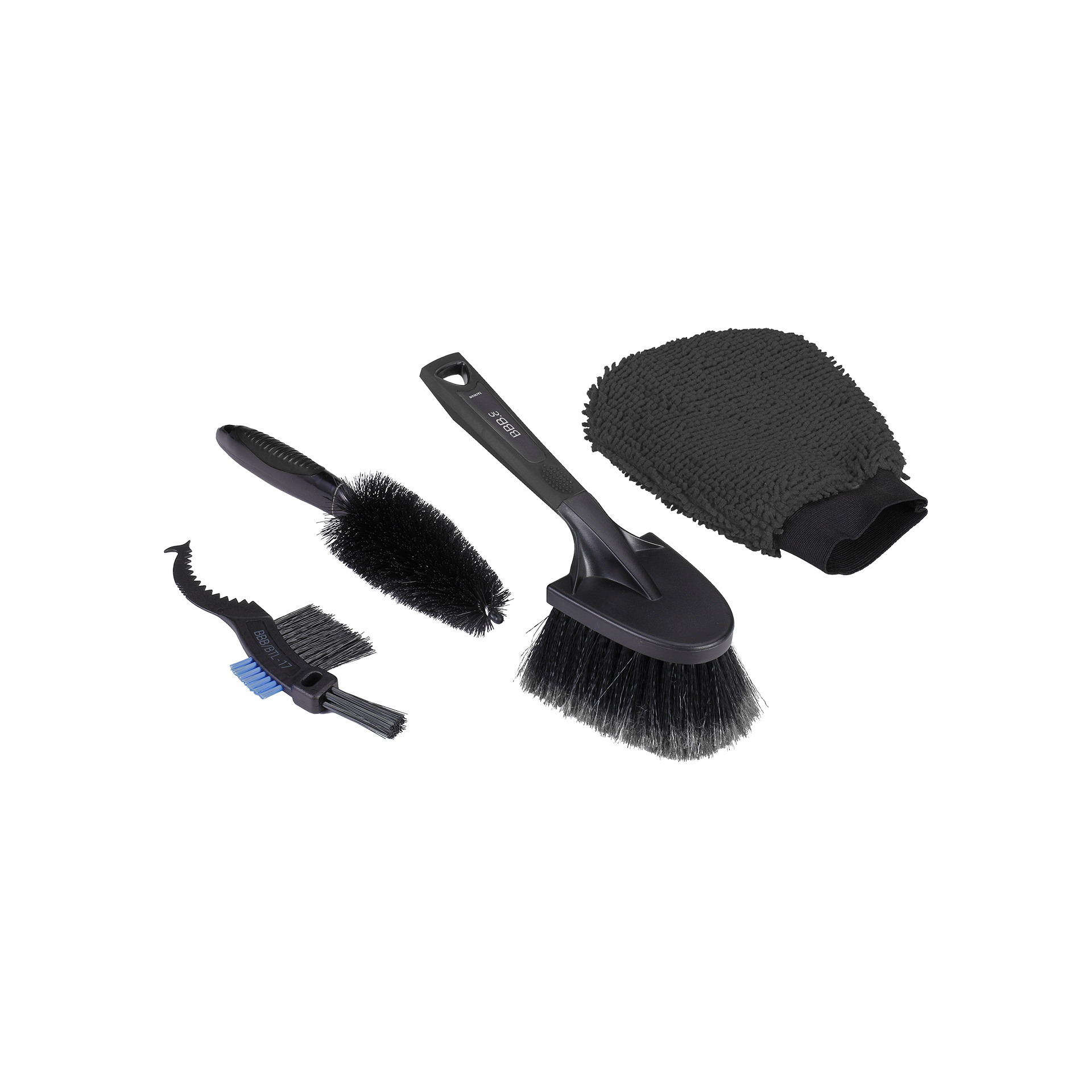 BBB FrameSet børstesæt (4 dele). Børsterne og mikrofiber-handsken er specielt designet til selv at nå de vanskeligste steder på din cyklen.