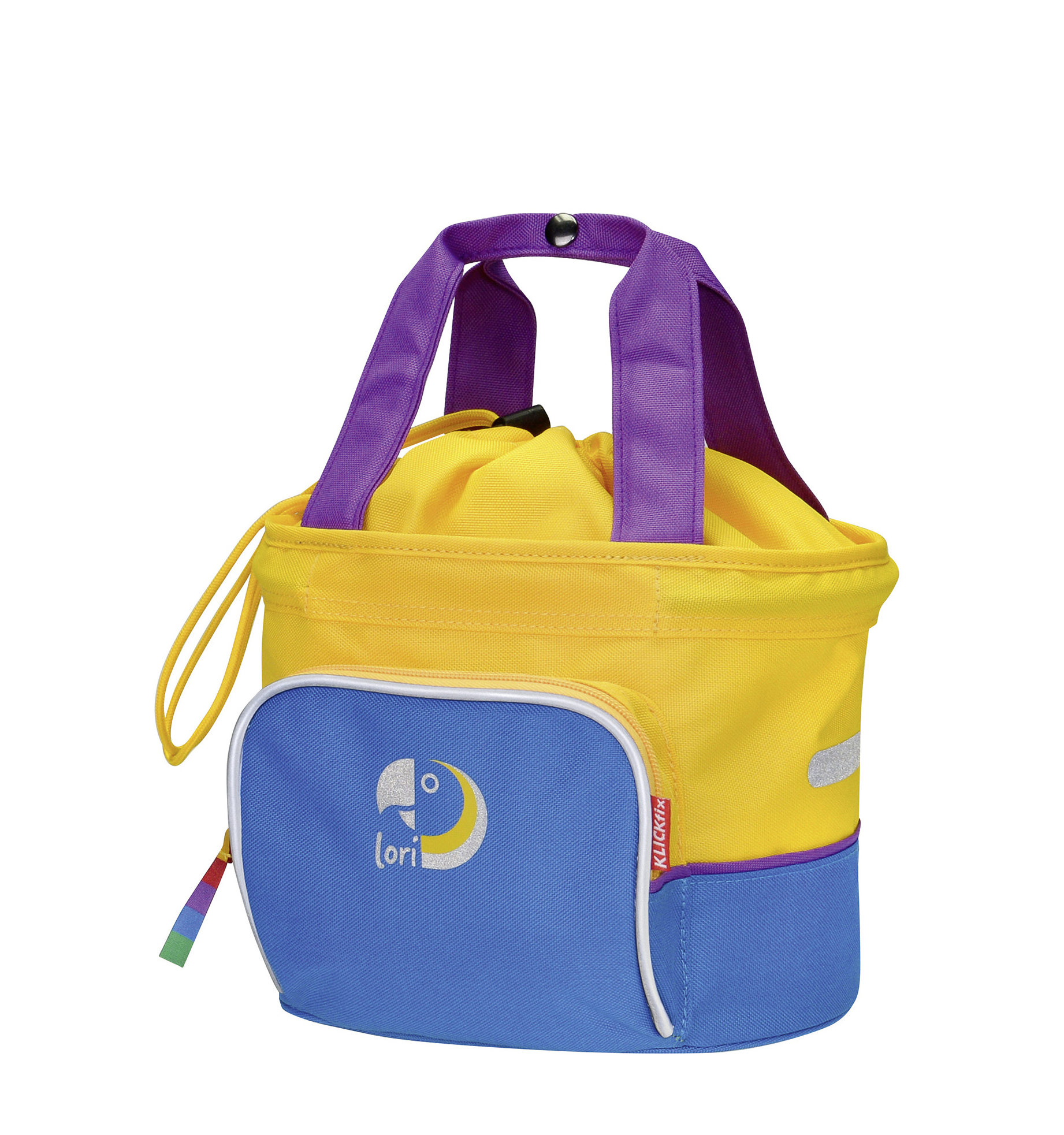 Med denne farverige stofkurv kan selv de smÃ¥ tage deres elskede kÊletÞj eller snacks med til en picnic "pÃ¥ tur". Takket vÊre det alsidige Klickfix styradaptersystem kan kurven bruges pÃ¥ en lang rÊkke cykler, trehjulede cykler eller lÞbehjul Lori-shopper er en cykelkurv af hÞj kvalitet, som kan bruges til sikker transport af smÃ¥ og store ”skatte”. Aluminiumsbeslaget gÞr kurven sÊrlig let. Hovedrummet med snÞre er nemt at Ã¥bne og lukke.