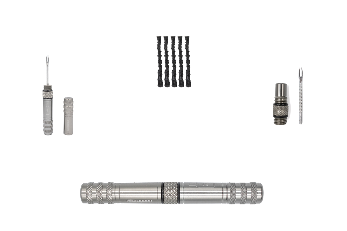 Indeholder alt, hvad du behøver for at reparere tubeless dæk: Tubeless plugs, stærk plugger tool, CO2 pumpe og CO2 patroner.