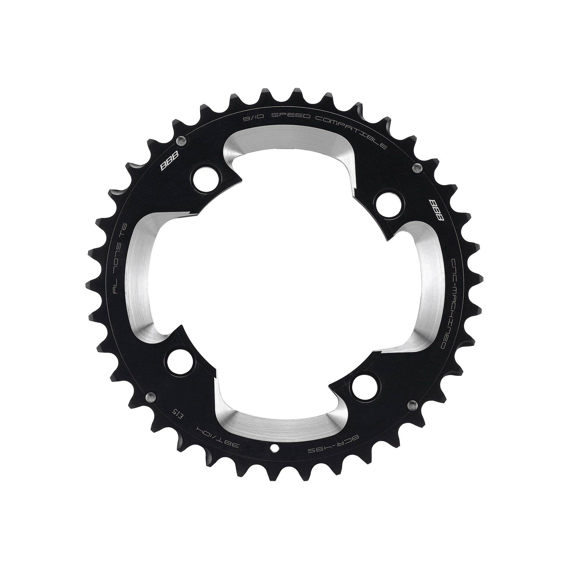 BBB MTBGear klinge 38T til triple kranksæt. 9-10 speed, ø104, 4 hul, vægt: 72 g. CNC fræset i 7075 T6 aluminium.